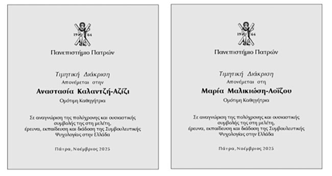 Το ΔΠΜΣ «Επαγγελματική Συμβουλευτική» – διά του διευθυντή προγράμματος σπουδών κ. Στέφανου Βασιλόπουλου – τίμησε τις ομότιμες καθηγήτριες κυρίες Μαλικιώση-Λοϊζου και Καλαντζή-Αζίζι για την πολυετή προσφορά τους στη μελέτη, έρευνα, εκπαίδευση και διάδοση της Συμβουλευτικής Ψυχολογίας στην Ελλάδα (Σάββατο, 8/11/2025, Τμήμα Οικονομικών Επιστημών, Αμφ.1). Την τιμητική πλακέτα παρέλαβαν η κα Φωτεινή Λοϊζου (κόρη της κας Μαλικιώση-Λοϊζου) και ο καθηγητής Συμβουλευτικής Ψυχολογίας στο Πανεπιστήμιο Κρήτης κος Θεόδωρος Γιοβαζολιάς (εκ μέρους της κας Καλαντζή-Αζίζι).